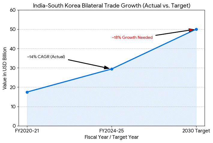 Bilateral trade between India and South Korea has grown steadily, reaching USD 29.39 billion in FY 2024-25. To hit the USD 50 billion target by 2030, officials estimate a required annual growth rate of approximately 18 percent over the coming years.